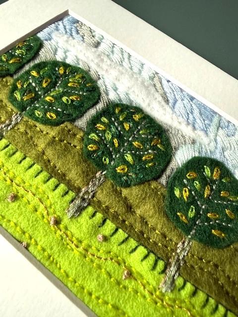 Hand embroidered panel using felt and appliqued with small stitches for texture. Each piece is hand-cut and applied with care, individually designed. Created in Shropshire and inspired by the gorgeous gardens at Dunrobin Castle in The Highlands.