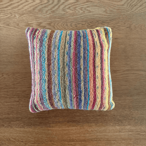 Hand knitted in Shropshire using 4ply yarn, allowing the randomness of the dye colours to create texture and interest. A mosaic of squares. Each cushion is unique.