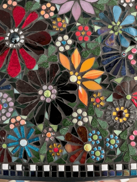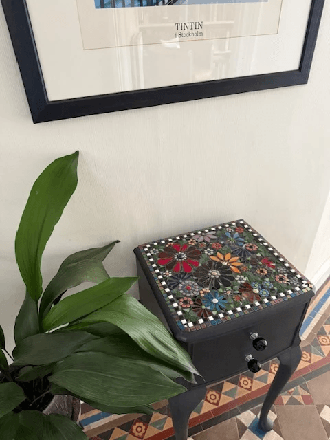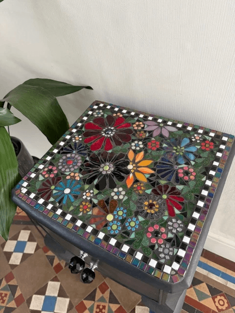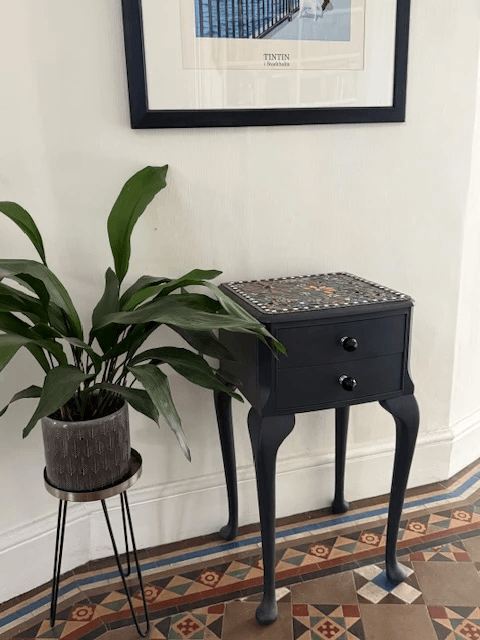 This small table has been upcycled with several coats of Farrow & Ball 'Off Black' exterior eggshell and a new mosaic design for the top the table and is now revived. The metal drawer handles have been changed to some faceted black glass. Pretty and practical, in any room in the home.