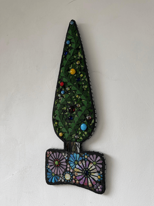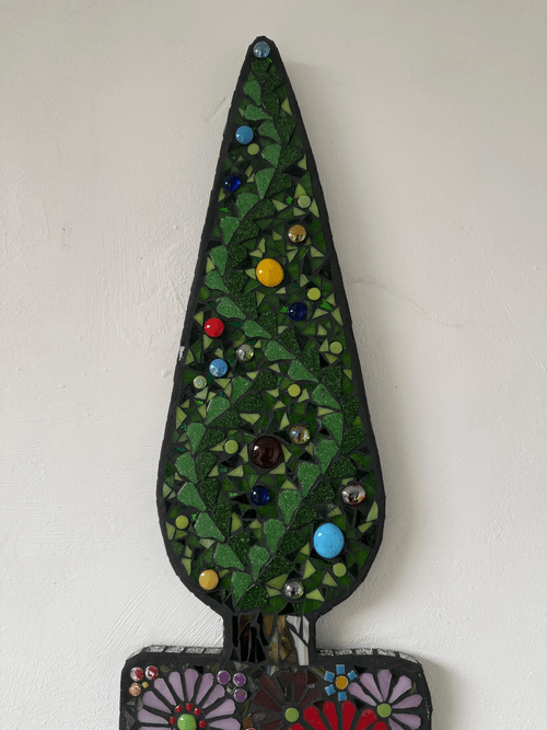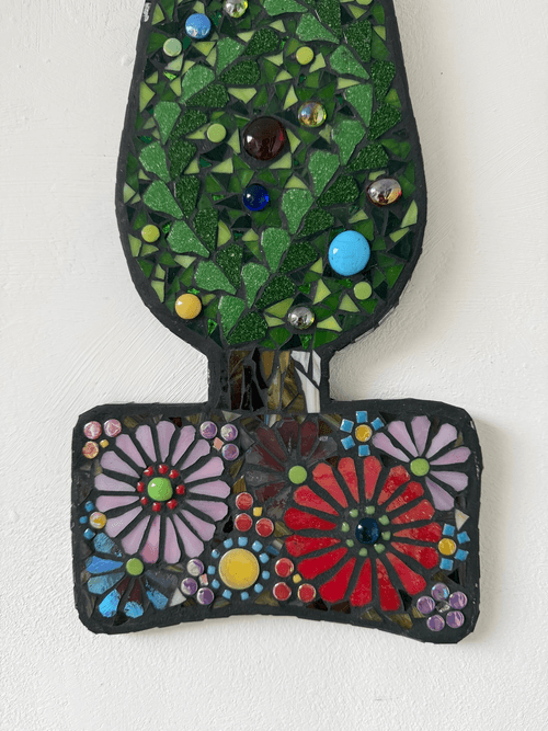 Gorgeous multi-coloured pops of colour to brighten up a garden wall. The taper tree shape was inspired by 1920s china designs. The individually handcut petals are cut from richly coloured stained glass and edged in silver mirror tiles. Grouted in black.