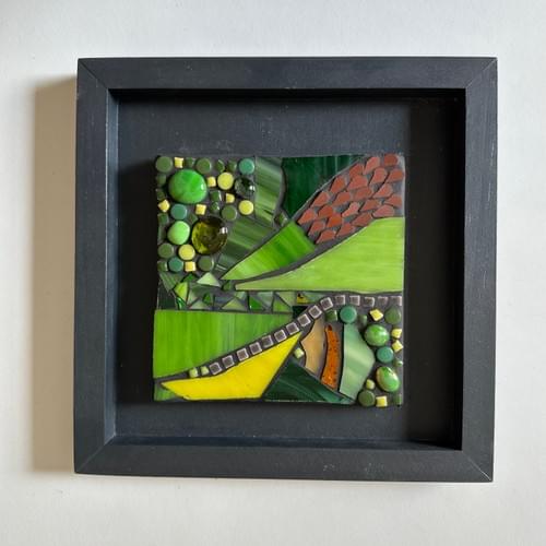Inspired by drone photographs of landscapes of my home county of Shropshire, this 20cm float framed mosaic sings with green stained glass pieces. All hand cut and mounted on a lightweight panel within the hand painted black frame. Texture is created by using glass cabochon tiles of varying sizes and colours of the landscape.