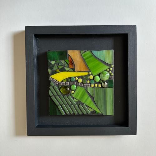 Inspired by drone photographs of landscapes of my home county of Shropshire, this 20cm float framed mosaic sings with green stained glass pieces. All hand cut and mounted on a lightweight panel within the hand painted black frame. Texture is created by using glass cabochon tiles of varying sizes and colours of the landscape.