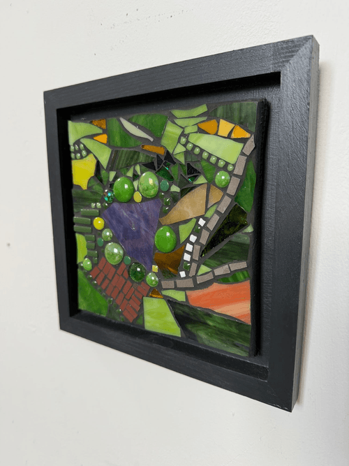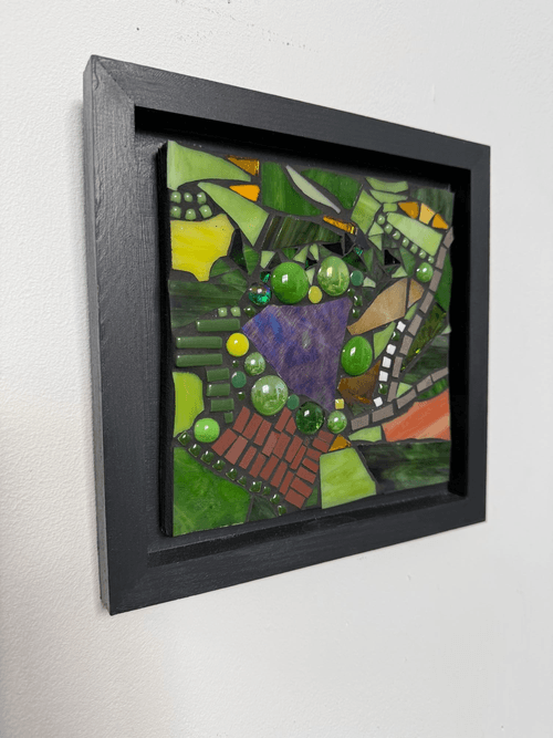 Inspired by drone photographs of landscapes of my home county of Shropshire, this 20cm float framed mosaic sings with green stained glass pieces. All hand cut and mounted on a lightweight panel within the hand painted black frame. Texture is created by using glass cabochon tiles of varying sizes and colours of the landscape.