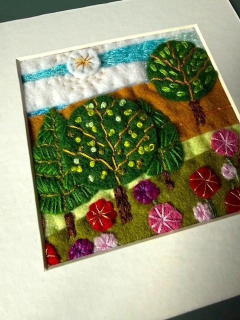Hand embroidered panel using felt and appliqued with small stitches for texture. Each piece is hand-cut and applied with care, individually designed. Created in Shropshire and inspired by the gorgeous British countryside.