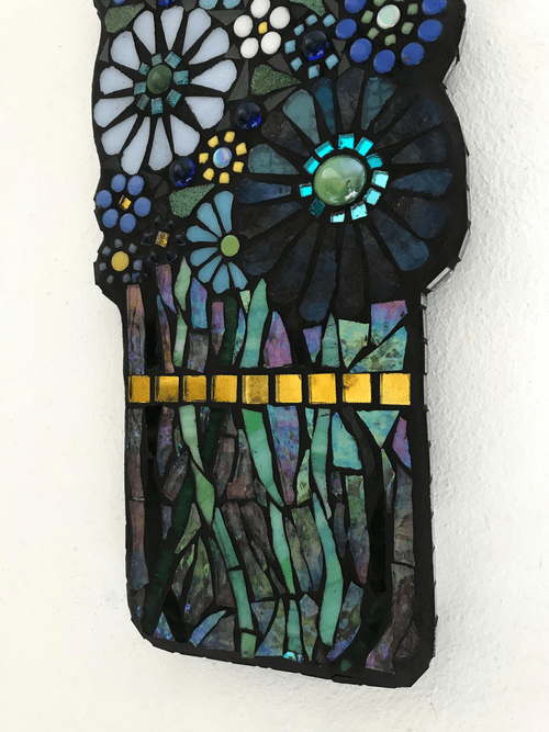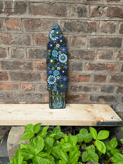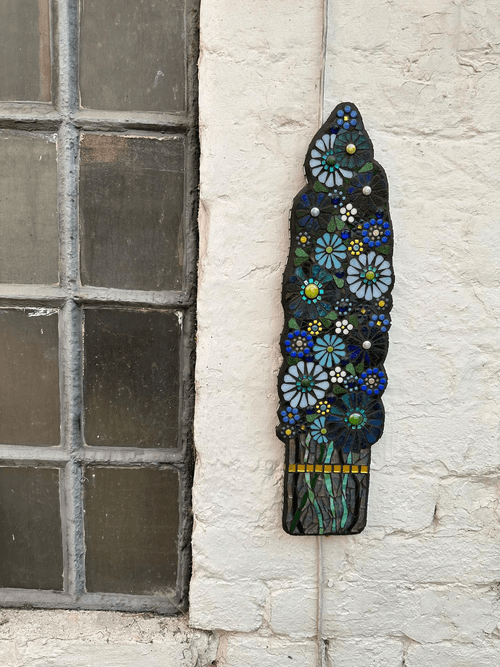Inspired by the gorgeous dark blue delphiniums in the garden, this pretty wall panel can be hung either inside or outside. The glass flowers are hand cut, each petal shaped from a range of blue and turquoise stained glass. Edged in silver mirror tiles to catch the light. Handmade in Shropshire.